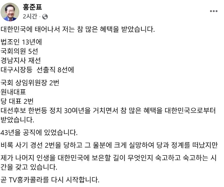 홍 전 시장은 이날 페이스북에서 "비록 사기 경선 2번을 당하고 그 울분에 크게 실망해 당과 정계를 떠났지만, 나머지 인생을 대한민국에 보은할 길이 무엇인지 숙고하고 숙고하는 시간을 갖고 있다"고 말했다.