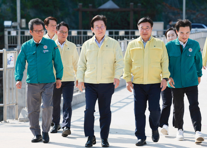 이재명 대통령이 30일 강원 강릉시 성산면 오봉저수지를 방문해 윤호중 행정안전부 장관, 김진태 강원도지사 등과 함께 가뭄 상황을 점검하며 이동하고 있다. 연합뉴스 |