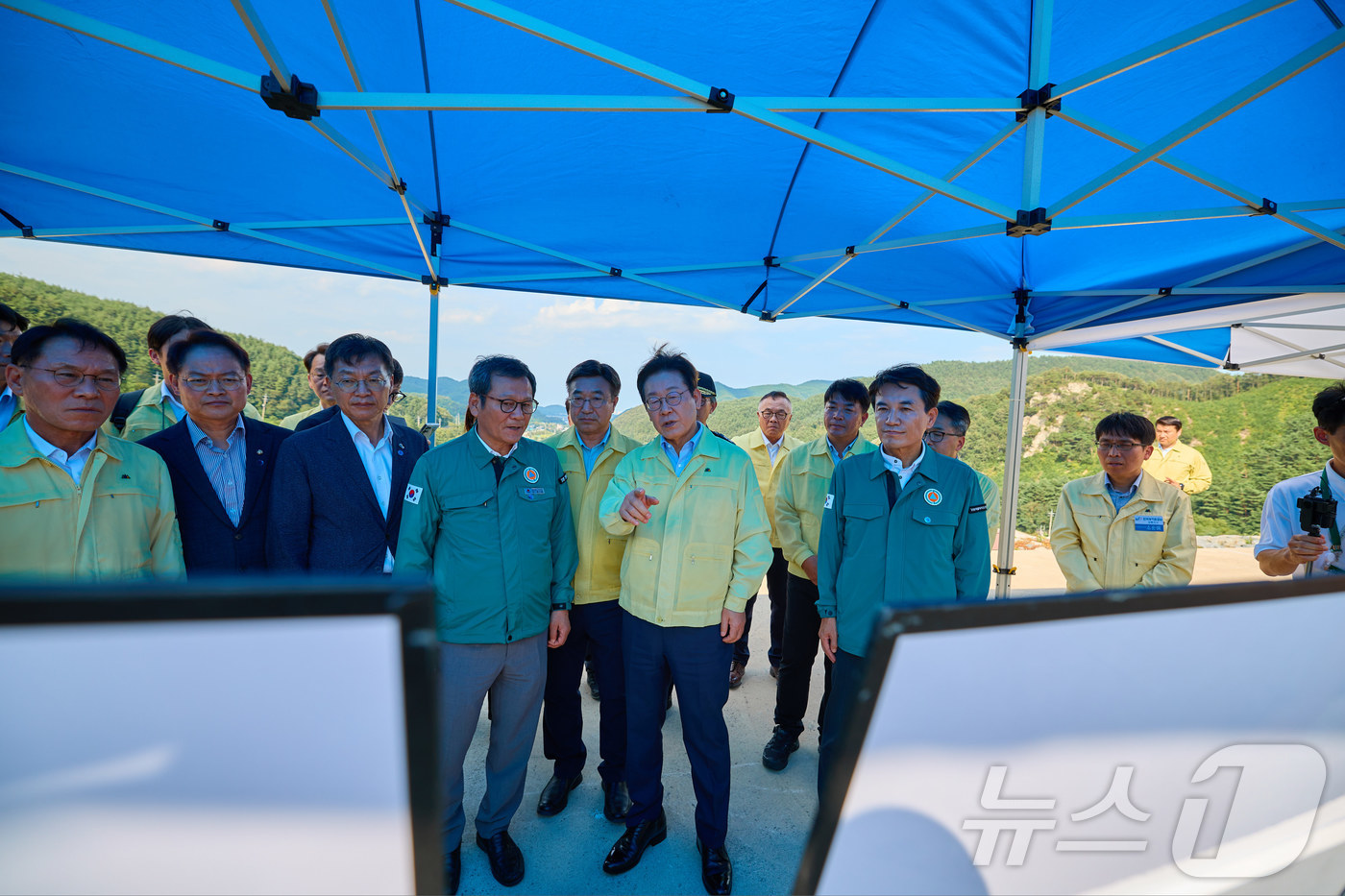 (서울=뉴스1) 허경 기자 = 이재명 대통령이 30일 강원 강릉시 성산면 오봉저수지를 방문해 가뭄 피해 상황 등을 점검하고 있다. (대통령실 제공. 재판매 및 DB 금지) 2025.8.30/뉴스1