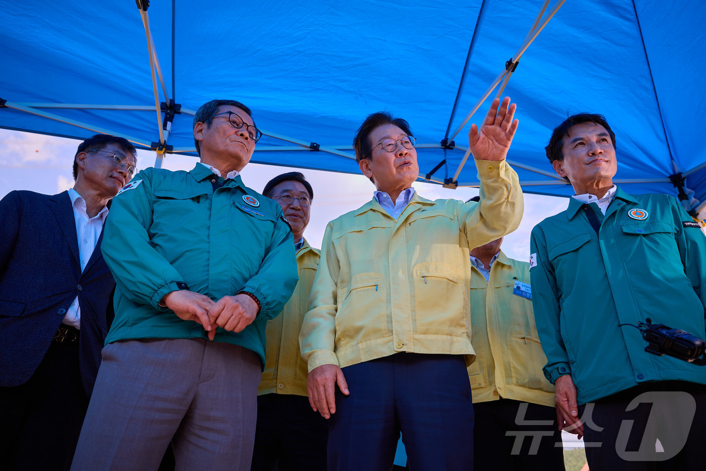 (서울=뉴스1) 허경 기자 = 이재명 대통령이 30일 강원 강릉시 성산면 오봉저수지를 방문해 가뭄 피해 상황 등을 점검하고 있다. (대통령실 제공. 재판매 및 DB 금지) 2025.8.30/뉴스1
