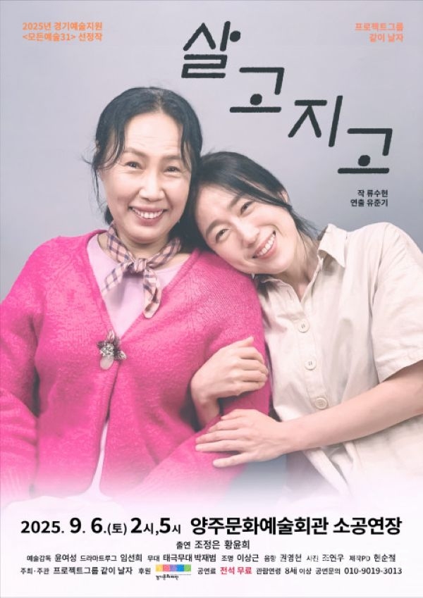 연극 '살고지고'는 2025년 경기예술지원 모든예술31 선정작으로 엄마와 딸이, 시어머니와 며느리가, 아들과 어머니가, 부부가 자녀와 함께 관람할 수 있는 재미있고 감동적인 작품이다. 경기도 양주 지역의 소극장 연극 활성화와 문화 예술 향유를 위해 경기문화재단의 후원을 받아 극단 프로젝트그룹 같이 날자가 제작, 무료 공연한다.
