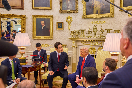이재명 대통령이 25일(현지시간) 미국 워싱턴DC 백악관에서 도널드 트럼프 미국 대통령과 한미정상회담을 하고 있다. 빨간 원은 B-2 모형. 김현동 기자 |