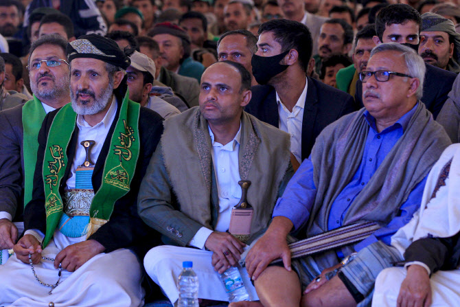 후티 정치위원회 지도자 마흐디 알마샷(가운데)이 2023년 9월 16일 예멘 수도 사나의 한 모스크에서 열린 행사에 참석하고 있다.(사진=AFP) |