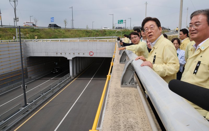 이재명 대통령이 7월 14일 충북 청주시 흥덕구 오송읍 궁평2지하차도를 방문해 안전시설 현황 점검을 하고 있다. 오송 지하차도 참사는 지난 2023년 7월15일 청주 흥덕구 오송읍 궁평2지하차도가 인근 미호강 범람으로 침수되면서 발생했다. 뉴시스. |