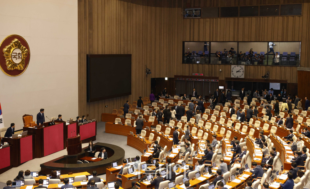 국민의힘 의원들이 27일 서울 여의도 국회에서 열린 본회의에서 이상현, 우인식 국가인권위원회 위원 선출안이 부결되자 퇴장하고 있다. 고이란 기자 photoeran@ |