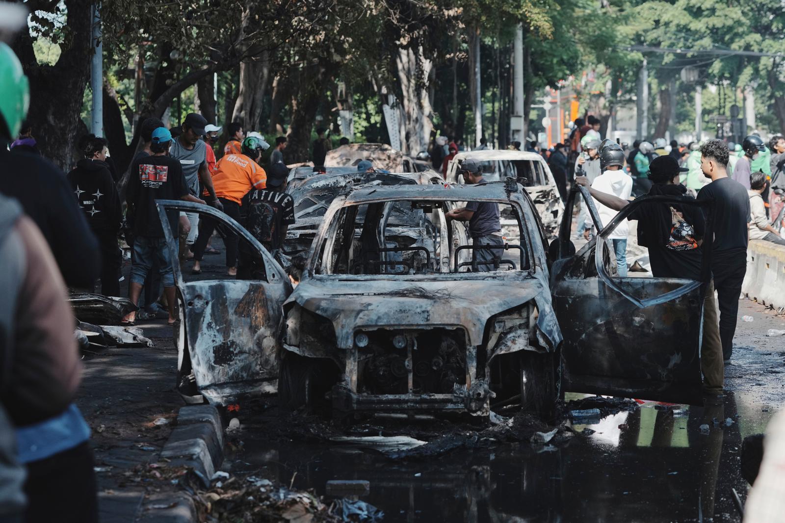 29일(현지 시간) 인도네시아 자카르타에서 시민들이 전날 국회의원들에게 지급되는 과도한 수당에 항의하는 시위 중 불에 탄 차량 잔해를 살펴보고 있다. 2025.08.29 자카르타=AP/뉴시스 |