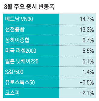 올 상반기에 28% 오르며 주요국 중 가장 높은 상승률을 기록했던 코스피는 8월엔 2.1% 하락하며 사실상 주요국 증시 중 최하위였다.