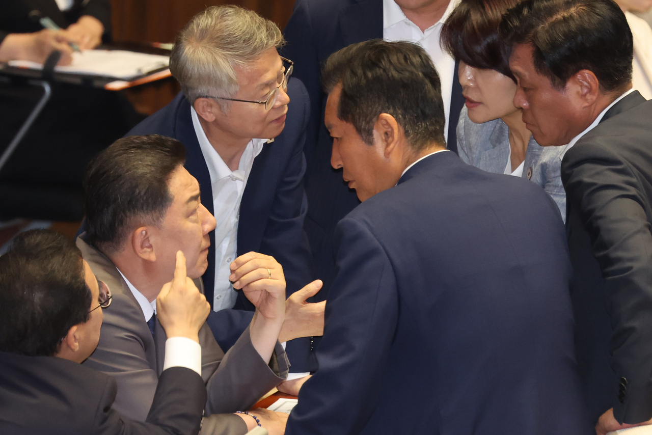 27일 국회 본회의에서 국민의힘 의원들이 퇴장하자 정청래 더불어민주당 대표와 김병기 원내대표 등 여당 지도부가 모여 대책을 논의하고 있다. [연합] |