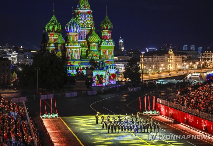 26일(현지시간) 러시아 모스크바에서 열린 국제군사음악제에서 공연 중인 연방보안국 국경수비대 중앙악대원들. [사진 = EPA 연합뉴스] |