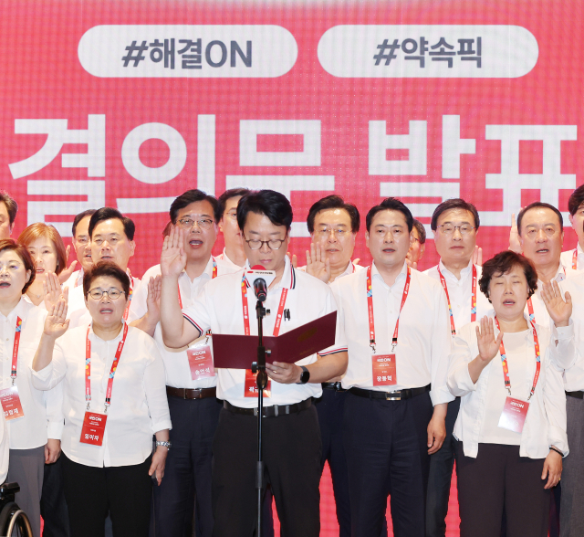 ▲29일 인천국제공항공사 항공교육원에서 열린 2025 국민의힘 국회의원 연찬회에서 장동혁 대표, 송언석 원내대표 등 의원들이 결의문을 발표하고 있다. ⓒ연합뉴스 |
