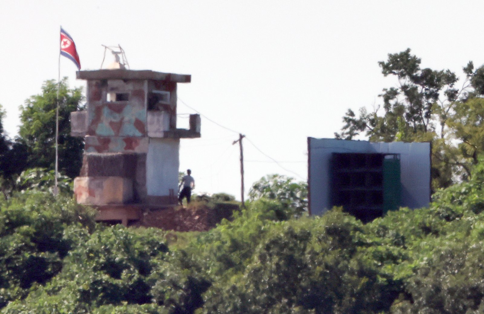 북한이 대남 확성기 철거를 시작한 것으로 확인된 10일 경기도 파주시 접경지역에서 바라본 북한 군 초소에 대남 확성기가 설치돼 있다. 2025.08.10. [파주=뉴시스] |