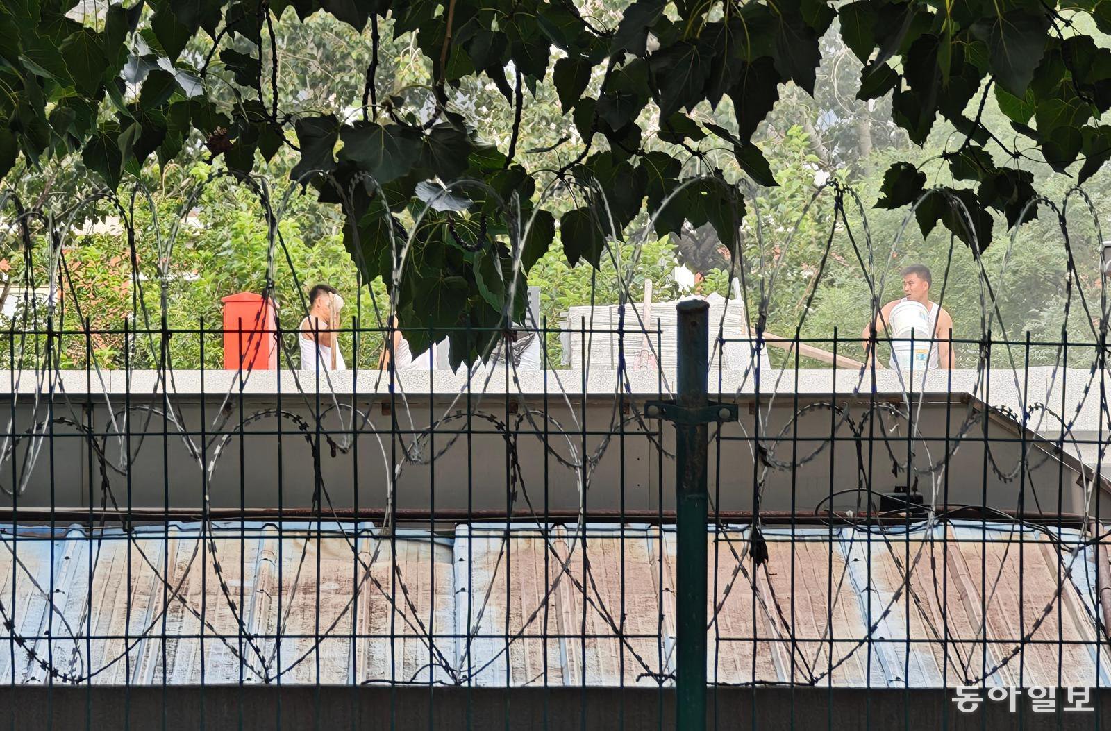 지난달 30일 중국 베이징의 주중국 북한대사관 모습. 철조망 너머로 공사 중인 인부들이 땀을 닦고 있다. 베이징=김철중 특파원 tnf@donga.com |
