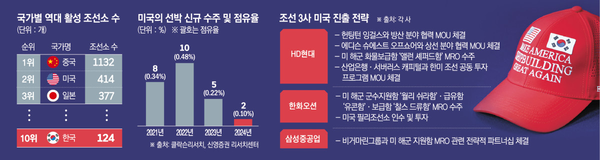 31일 영국 조선·해운 시황 분석기관 클락슨리서치와 신영증권에 따르면 지난해 말 기준 미국에서 조선업을 영위한 조선소는 414곳으로 중국(1132곳)에 이어 세계 2위였다. 하지만 지금은 경쟁력이 크게 약화됐다. 수주 잔액을 보유한 미국 조선소는 21곳에 불과하며 이 중 12곳은 단 1척의 수주 잔액만 갖고 있다. 지난해 전 세계 선박 발주량(1910척) 가운데 미국의 수주 실적은 2척에 그쳤고 그마저도 대부분 중소형 작업선 수준이었다.