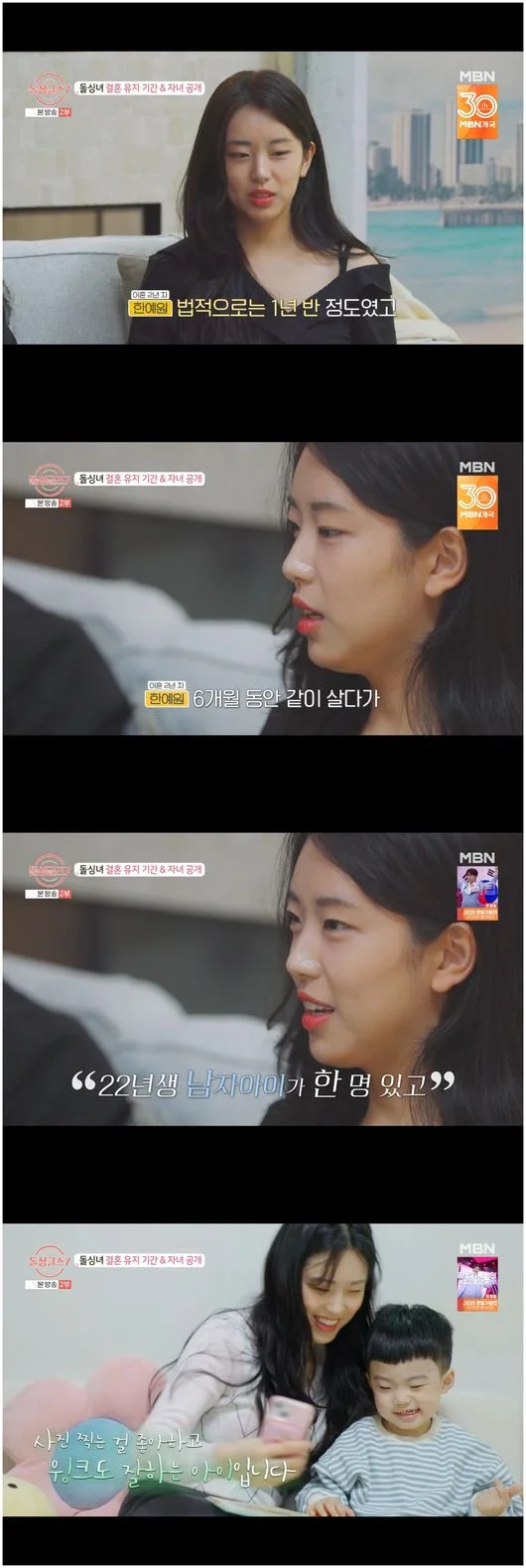 31일 방영한 MBN ‘돌싱글즈7’에서27살의 가장 앳된 한예원은 “결혼 유지 기간은 법적으로는 1년 6개월인데, 같이 산 건 6개월이고 1년 동안 이혼하느라 별거를 했다. 나는 아이가 있다. 22년생 남자아이가 한 명 있고, 임신 6개월쯤 전남편한테서 갑자기 이혼하자는 통보를 받았다”라고 말해 함께 있던 사람들을 놀라게 했다.