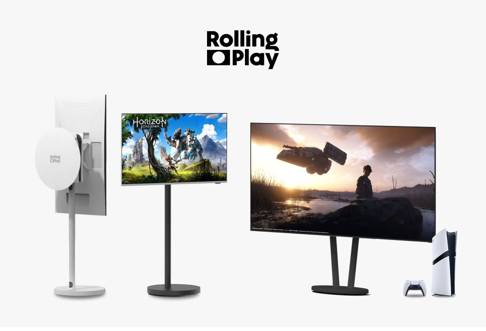 롤링플레이는 이동형 TV 스탠드 디자인을 기반으로, 모니터·TV 후면에 플레이스테이션5를 거치하는 구조가 핵심이다. TV를 옮길 때 콘솔을 따로 들고 이동하지 않아도 되며, 후면 원형 가림판이 콘솔을 깔끔하게 감춰 인테리어 효과까지 살렸다.