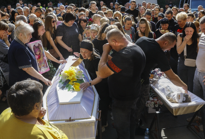 31일(현지시간) 우크라이나 키이우 인근에서 열린 영결식에서 러시아의 공습으로 숨진 두 살배기 딸 안젤리나와 어머니 나디야 갈리치의 관을 지켜보던 유가족과 지인들이 슬픔에 잠겨 있다. 24세의 나디야와 어린 딸은 지난 28일 키이우의 주거지역에 대한 러시아의 미사일 공격으로 목숨을 잃었다./EPA 연합뉴스 |