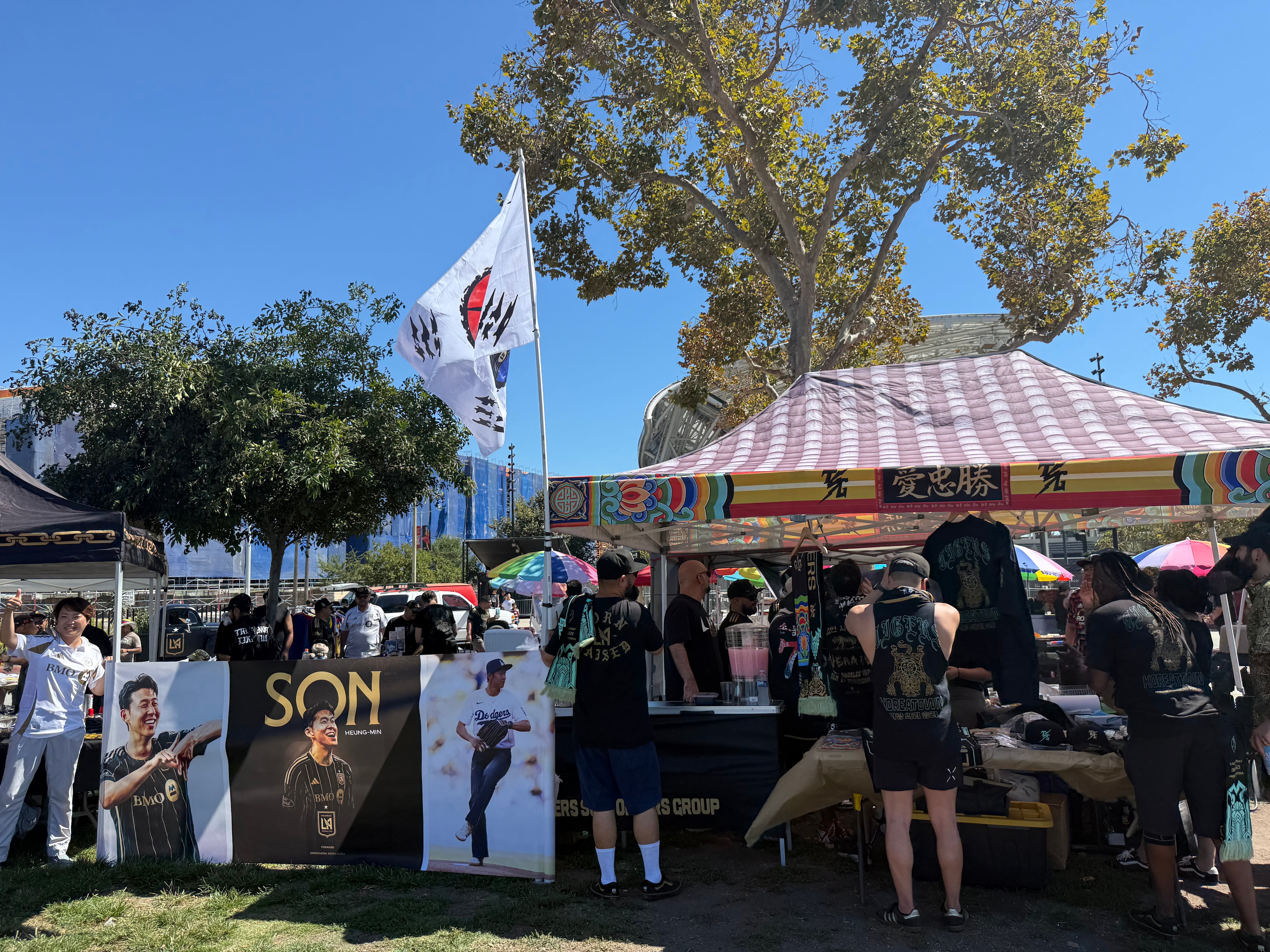 31일(현지 시각) 미 로스앤젤레스 BMO스타디움 인근 잔디밭에서 LAFC의 축구팬들이 경기 전 응원 행사를 갖고 있다. 태극기와 손흥민의 플래카드가 걸린 이 부스에선 한글과 손흥민 얼굴이 새겨진 각종 굿즈를 팔고 있었다./강다은 기자 |