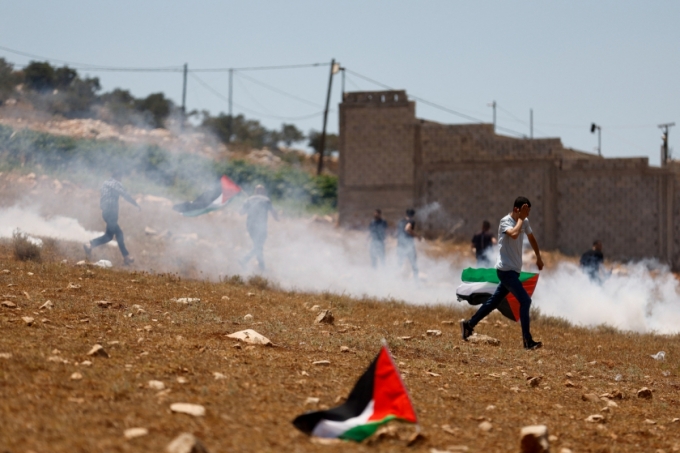 이스라엘이 점령한 서안지구 제닌 근처 라바에서 시위를 벌이고 있는 팔레스타인인들과 경계를 서고 있는 이스라엘군. 2025.7.18 /로이터=뉴스1 |
