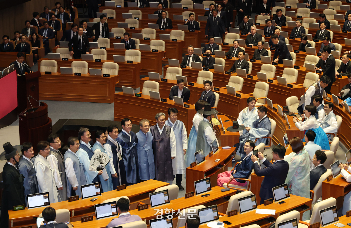 각종 개혁 입법과 이재명 정부 첫 예산안을 두고 100일간의 대장정에 돌입하는 정기국회가 한복과 상복이라는 드레스 코드 대결로 시작됐다. 한복을 차려입은 우원식 국회의장은 1일 국회 본회의장 의장석에 올랐다. 더불어민주당 의원들도 마찬가지였다. 반면 국민의힘 의원들은 검은 넥타이를 맨 상복 차림이었다.