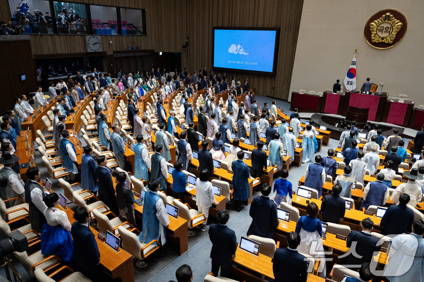 (서울=뉴스1) 김정률 임윤지 홍유진 기자 = 국회는 1일 이재명 정부 들어 첫 정기국회 개회식을 갖고 100일간 대장정에 돌입했다. 더불어민주당은 이날 개원식을 축하하는 의미에서 한복을 입었으나 국민의힘은 여당의 입법 독주에 반발해 상복을 입고 참석했다. 정부조직법 개정안 등 산적한 현안에 있어서도 양측은 첨예한 입장차를 보이고 있어 정기국회 내내 충돌이 불가피할 것으로 보인다.