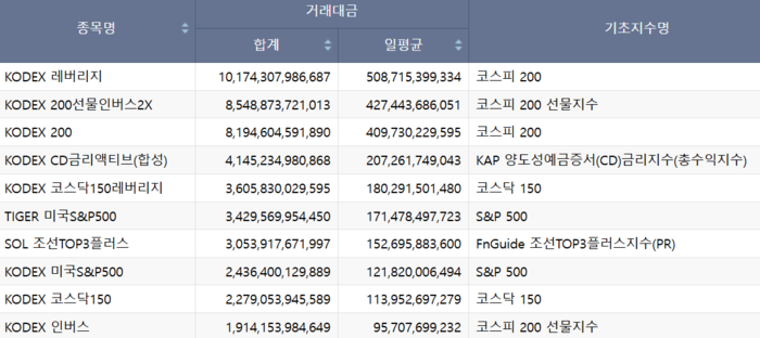 1일 한국거래소에 따르면 대표적 레버리지 상장지수펀드(ETF)인 KODEX 레버리지의 8월 일 평균 거래대금은 5087억원으로 전월(6664억원) 대비 23.66% 급감했다.