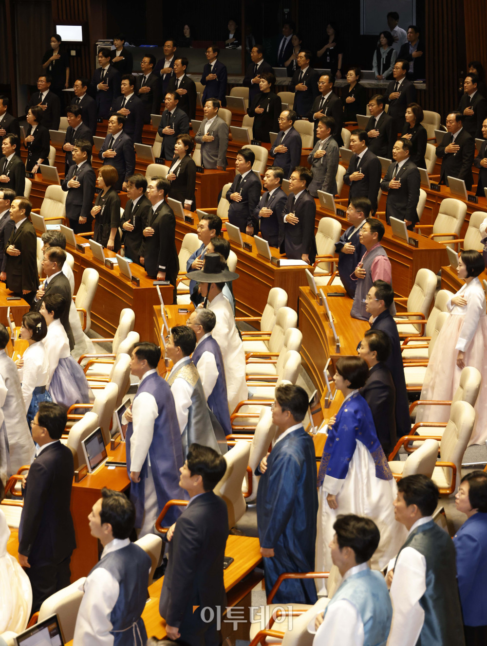 1일 서울 여의도 국회에서 열린 제429회 국회(정기회) 개회식에서 의원들이 한복을 입고 있다. 이날 국민의힘은 여당에 대한 항의의 의미를 담아 상복 차림으로 참석했다. 사진=고이란 기자 photoeran@ |
