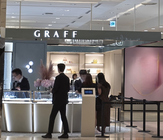 #지난달 23일 오후 서울의 한 백화점. 영국 주얼리 브랜드 그라프 매장에서 한 30대 커플이 나비 모양 장식이 달린 목걸이를 살펴보고 있다. 토요일임을 감안해도 이날 적잖은 이들이 대기줄을 걸어가며 매장을 찾았다.