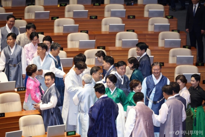 [서울=뉴시스] 김금보 기자 = 한복을 입은 더불어민주당 의원들이 1일 오후 서울 여의도 국회에서 열린 제22대 제429회국회(정기회) 제1차 본회의 산회 후 대화를 하고 있다. 2025.09.01. kgb@newsis.com /사진=김금보 |