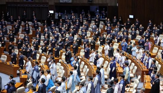 이날 정치권에 따르면 우원식 국회의장을 비롯한 더불어민주당과 조국혁신당 등 범진보진영 소속 의원들 대다수는 이날 정기국회 개회식에 한복을 갖춰 입고 참석했다. 이는 백혜련 민주당 의원의 제안으로 우 의장과 국회 의장단이 여야 의원들에게 요청한 사항이었다.