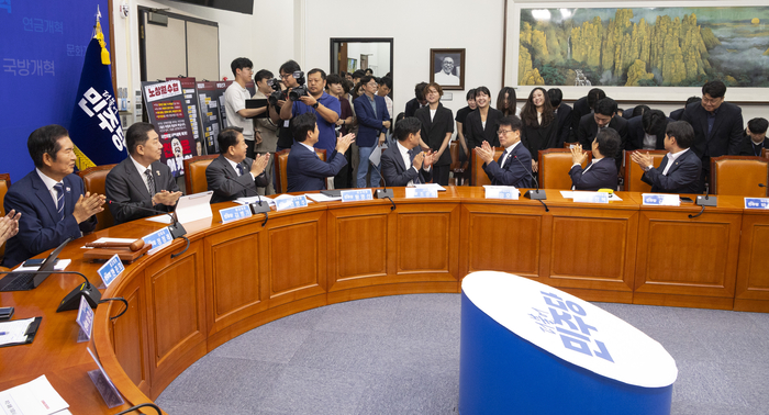 더불어민주당 정청래 대표와 김병기 원내대표를 비롯한 최고위원들이 정기국회 첫날인 1일 국회에서 열린 최고위원회의에서 당 회의 견학에 나선 민주당에 신입 당직자들을 환영하며 박수치고 있다. 연합뉴스 |