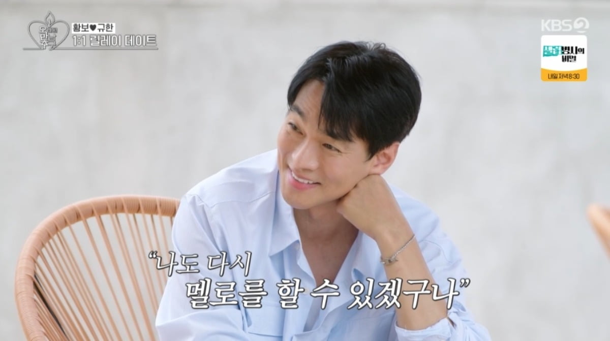 황보는 "이규한이 솔직하게 다 이야기해줘서 고맙더라"며 "끈데 눈 안에 그렁그렁한 눈물을 보고 너무 속상했다"고 했다. 이규한은 황보에게 "너랑 이렇게 시간을 보내고 나서 나도 다시 멜로를 할 수 있겠구나 싶더라"며 연애세포를 되찾았다고 했다. 황보는 "내가 누군가에게 그럴 수 있다는거 너무 좋은 말이다"고 말했다.