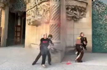 스페인 환경단체 ‘미래 식물’ 소속 활동가들이 지난달 31일(현지 시간) 바르셀로나의 사그라다 파밀리아 성당에 ‘페인트 테러’를 한 뒤 경찰에 끌려가고 있다. 사진 출처 스페인 환경단체 ‘푸투로베헤탈’ X |