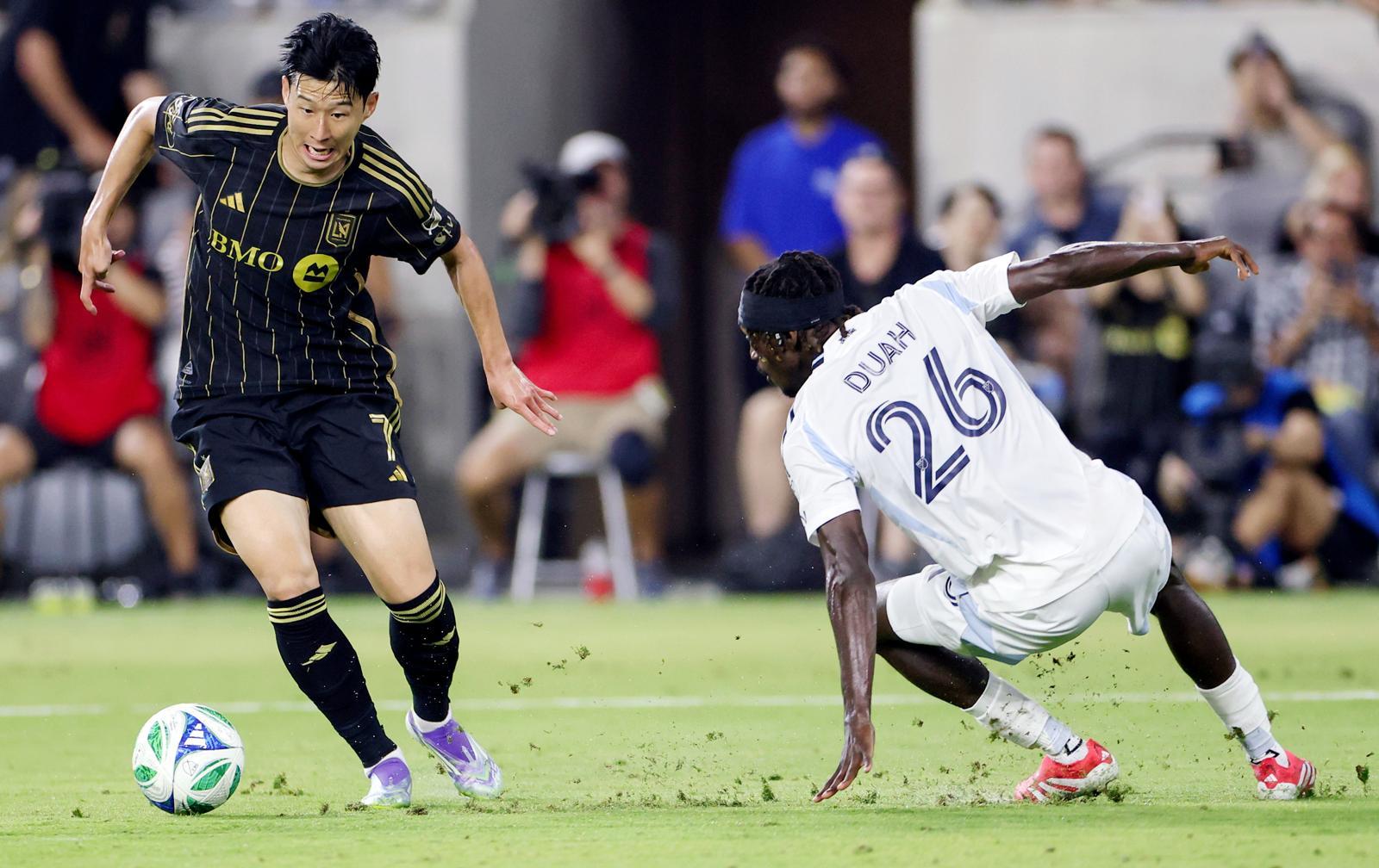 로스앤젤레스(LA) FC 손흥민(왼쪽)이 1일 열린 샌디에이고와의 미국 메이저리그사커(MLS) 안방경기에서 드리블로 상대 수비수 마누 두아를 제치고 있다. 손흥민은 이날 뜨거운 환영을 받으며 LA FC 안방 데뷔전을 치렀으나 득점엔 실패했다. 로스앤젤레스=AP 뉴시스 |