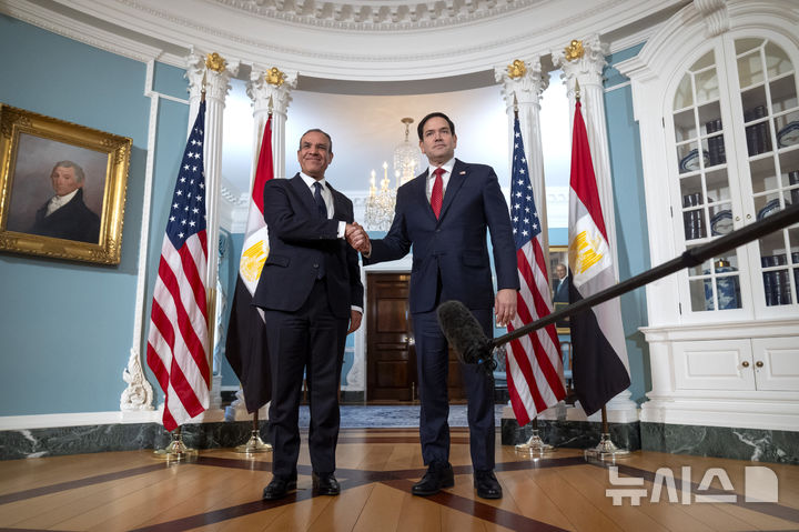 [워싱턴=AP/뉴시스] 바드르 압델라티(왼쪽) 외무장관이 2월10일 미국 워싱턴을 방문, 마코 루비오 미 국무장관과 악수하고 있다. 이집트 정부는 9월 1일 성명서에서 이스라엘군의 가자 시티 점령 정책을 비난하면서, 중재국들의 정전합의 노력에 위배되는 폭거라고 공격했다. 2025. 09.02. |