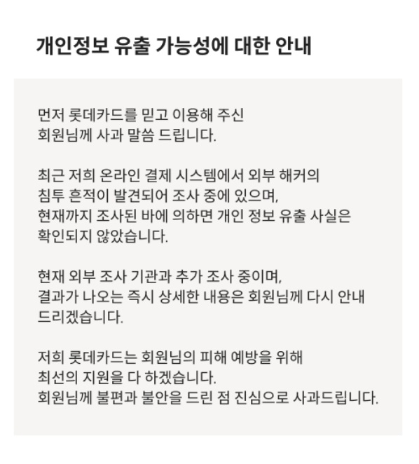 롯데카드는 보안 사고가 발생한 것은 맞으나, 개인정보 유출을 예단할 단계가 아니라는 입장이다. 롯데카드는 홈페이지 공지를 통해 "온라인 결제 시스템에서 외부 해커의 침투 흔적이 발견돼 조사 중에 있다"며 '현재까지 조사된 바에 의하면, 개인정보 유출 사실은 확인되지 않았다"고 말했다.