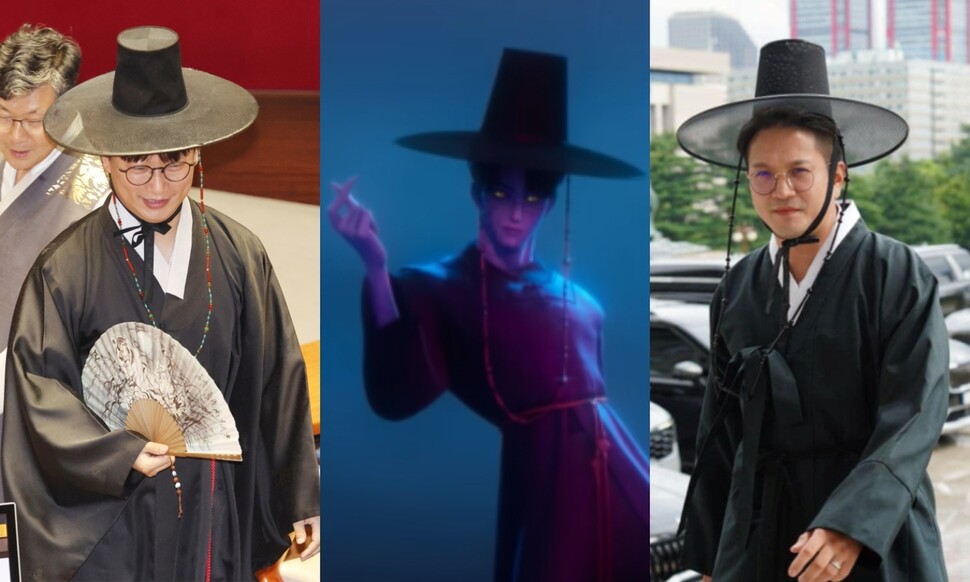 넷플릭스 애니메이션 ‘케이팝 데몬 헌터스’(케데헌)의 저승사자 복장을 따라 한 전용기, 모경종 더불어민주당 의원이다.
