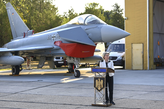 우르술라 폰데어라이엔 유럽연합 집행위원장이 1일(현지시간) 루마니아 콘스탄차 흑해 항구 인근 미하일 코갈니체누 공군기지에서 니쿠쇼르 다니엘 단 루마니아 대통령과 공동 기자회견을 하고 있다. AP=연합뉴스 |
