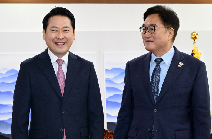 우원식 국회의장이 2일 예방한 장동력 국민의힘 대표를 맞이하고 있다. [공동취재] |