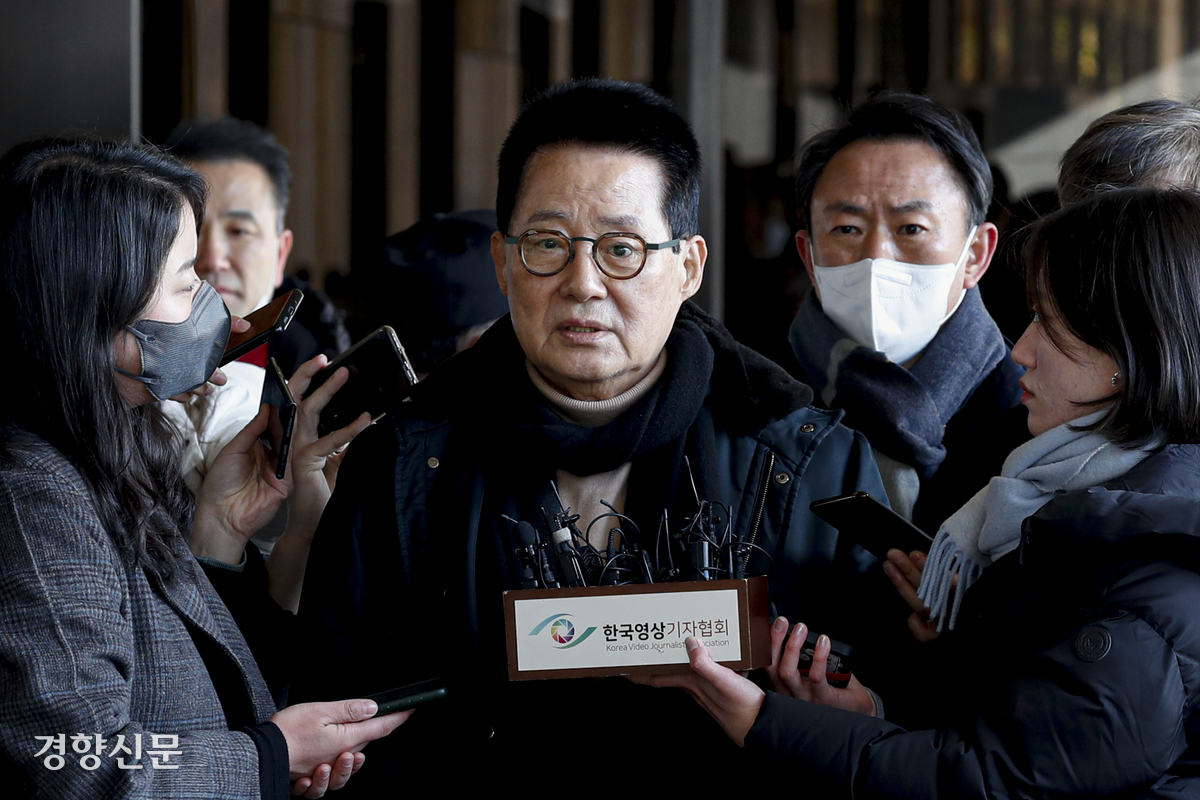 서해 공무원 피격 의혹 사건으로 고발된 박지원 전 국가정보원장이 2022년 12월 서울 서초구 서울중앙지검으로 출석하며 취재진에게 입장을 밝히고 있다. 문재원 기자 |