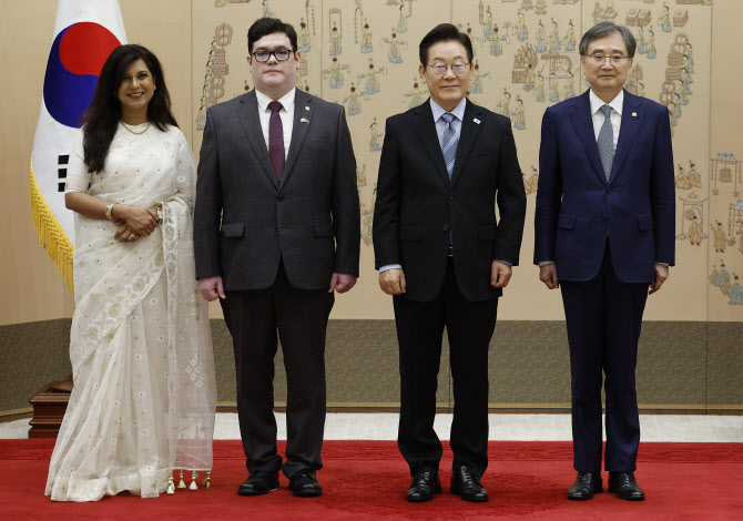 이재명 대통령이 2일 서울 용산 대통령실 청사에서 열린 주한대사 신임장 제정식에서 토피크 이슬람 샤틸 주한 방글라데시 대사(왼쪽 두 번째)로부터 신임장을 전달받은 뒤 기념촬영하고 있다.(사진=연합뉴스) |