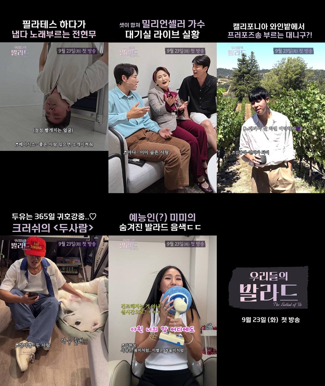 앞서 '탑백귀 대표단' 정재형, 차태현, 추성훈, 정승환의 일상 발라드가 담긴 티저 영상은 '우리들의 발라드'에 대한 기대감을 높였다. 이어 전현무, 박경림, 대니 구, 크러쉬, 미미의 애창곡을 확인할 수 있는 1차 티저 영상이 연달아 공개돼 시선을 사로잡고 있다.