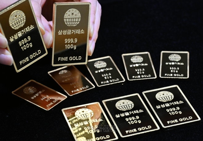 금과 은 가격이 급등세를 보이는 2일 서울 종로구 삼성금거래소에서 관계자가 골드바를 내보이고 있다. 홍윤기 기자 |