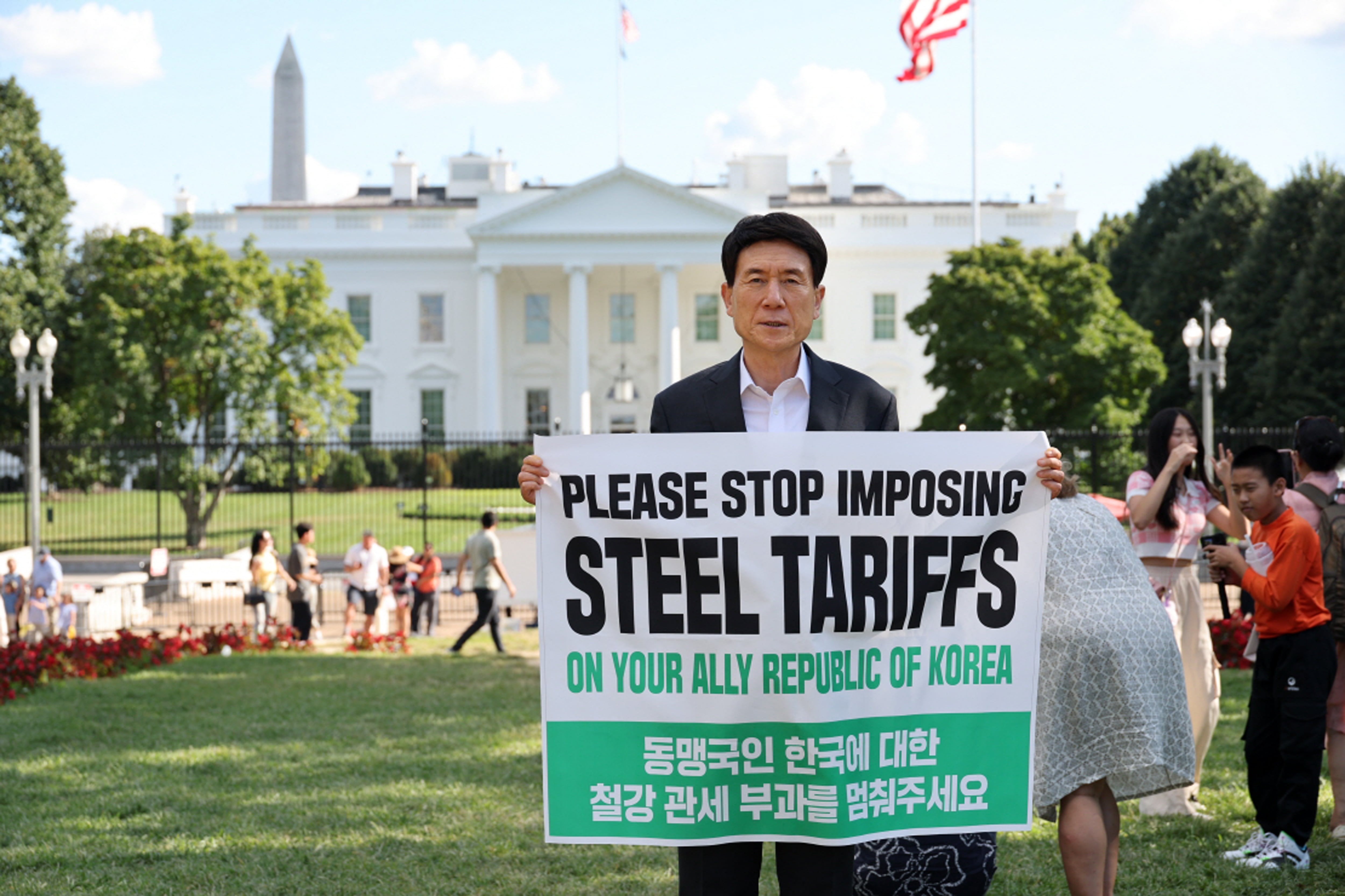 이강덕 경북 포항시장이 1일 미국 워싱턴 D.C. 백악관 앞에서 철강 관세 인하를 호소하는 시위를 벌였다.