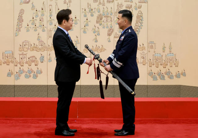 대통령실에 따르면 이 대통령은 이날 오후 3시 30분 서울 용산 대통령실에서 열린 '대장 진급·보직 신고 및 삼정검 수치 수여식'에서 대장 진급자들의 삼정검에 수치를 수여했다.
