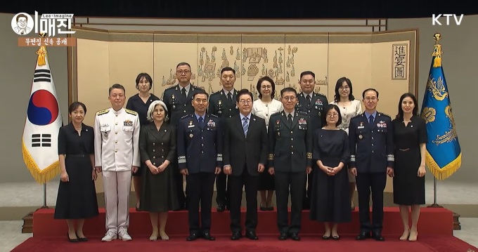 이재명 대통령이 2일 현 정부 출범 후 처음으로 군(軍) 장성 진급·보직 신고를 받고 대장 진급자 7명 부부와 함께 기념사진을 찍고 있다. [사진=KTV] |