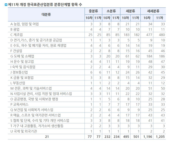 통계청 등에 따르면, 지난해 11차 개정된 현행 한국표준산업분류는 총 21개 대분류로 구성된다. 이중 AI 산업은 정보통신(IT)업에 해당해 출판업, 영상·오디오 기록물 제작 및 배급업, 우편 및 통신업 등과 같이 묶인다.