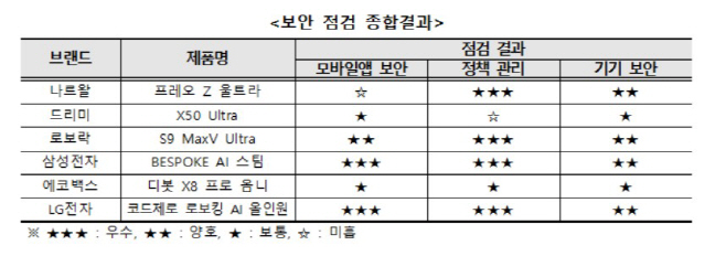 로봇청소기 6개 제품 보안 점검 종합결과./한국인터넷진흥원 |