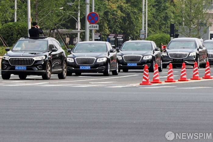 김정은 북한 국무위원장이 탑승한 것으로 예상되는 차량 행렬이 2025년 9월 2일 중국 베이징에서 열리는 제2차 세계대전 종전 80주년 기념 군사 퍼레이드를 앞두고 베이징역을 떠나고 있다. [사진=로이터 뉴스핌]
