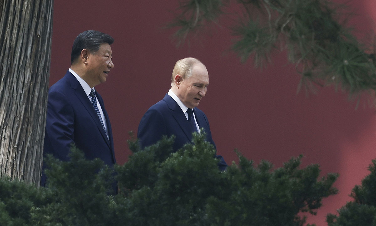 블라디미르 푸틴(왼쪽) 러시아 대통령과 시진핑 중국 국가주석이 2일(현지 시간) 중국 베이징 중난하이 관저에서 산책하며 대화하고 있다. AP연합뉴스 |