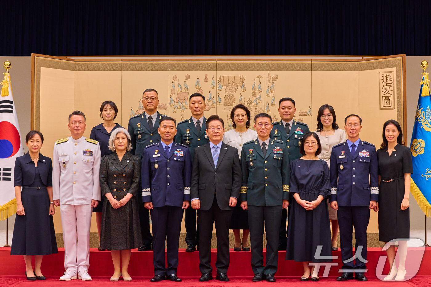 (서울=뉴스1) 허경 기자 = 이재명 대통령이 2일 서울 용산 대통령실 청사에서 열린 대장 진급·보직 신고 및 삼정검 수치 수여식에서 대장 진급자 등 참석자들과 기념촬영을 하고 있다. (대통령실 제공. 재판매 및 DB 금지) 2025.9.2/뉴스1